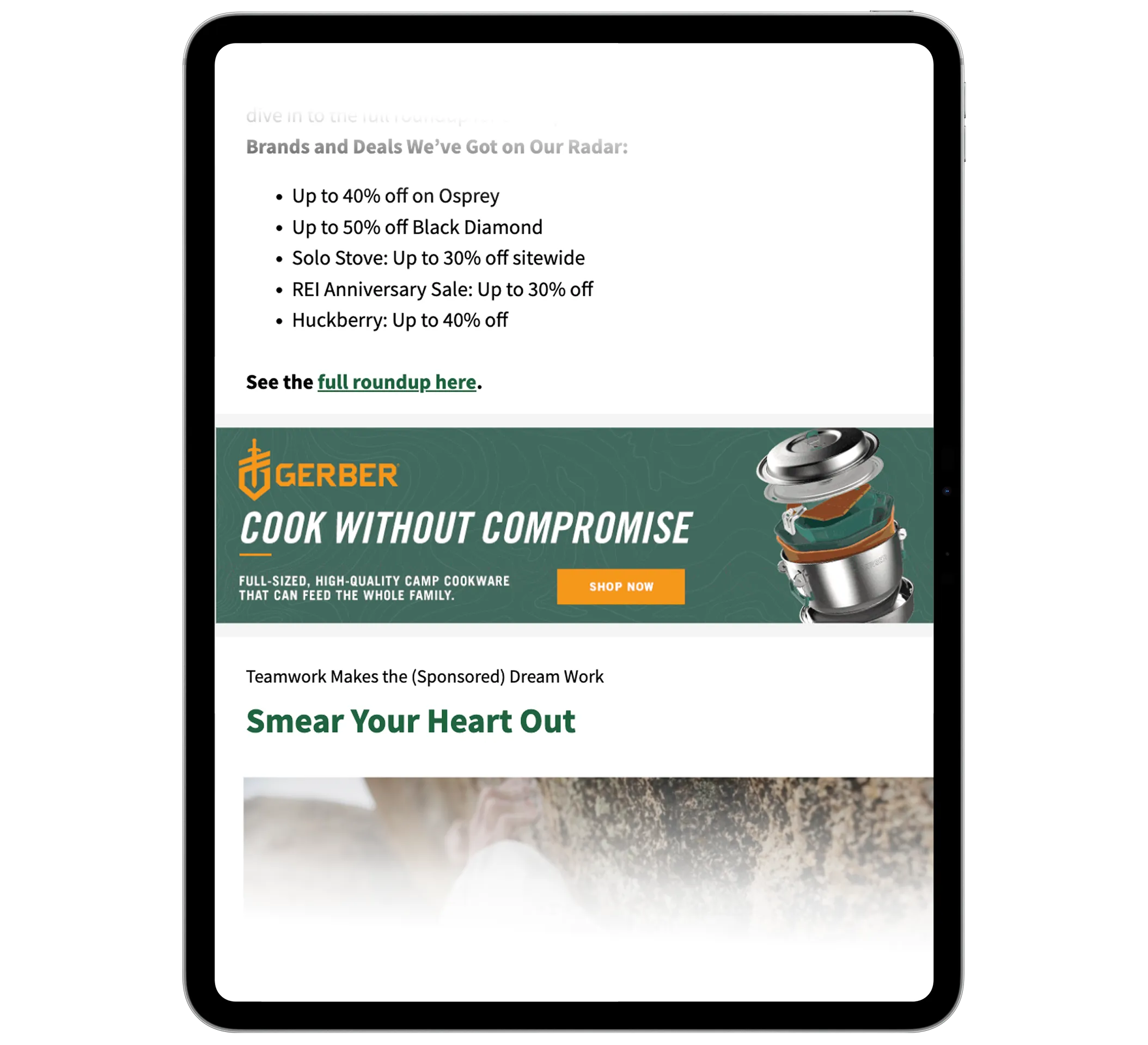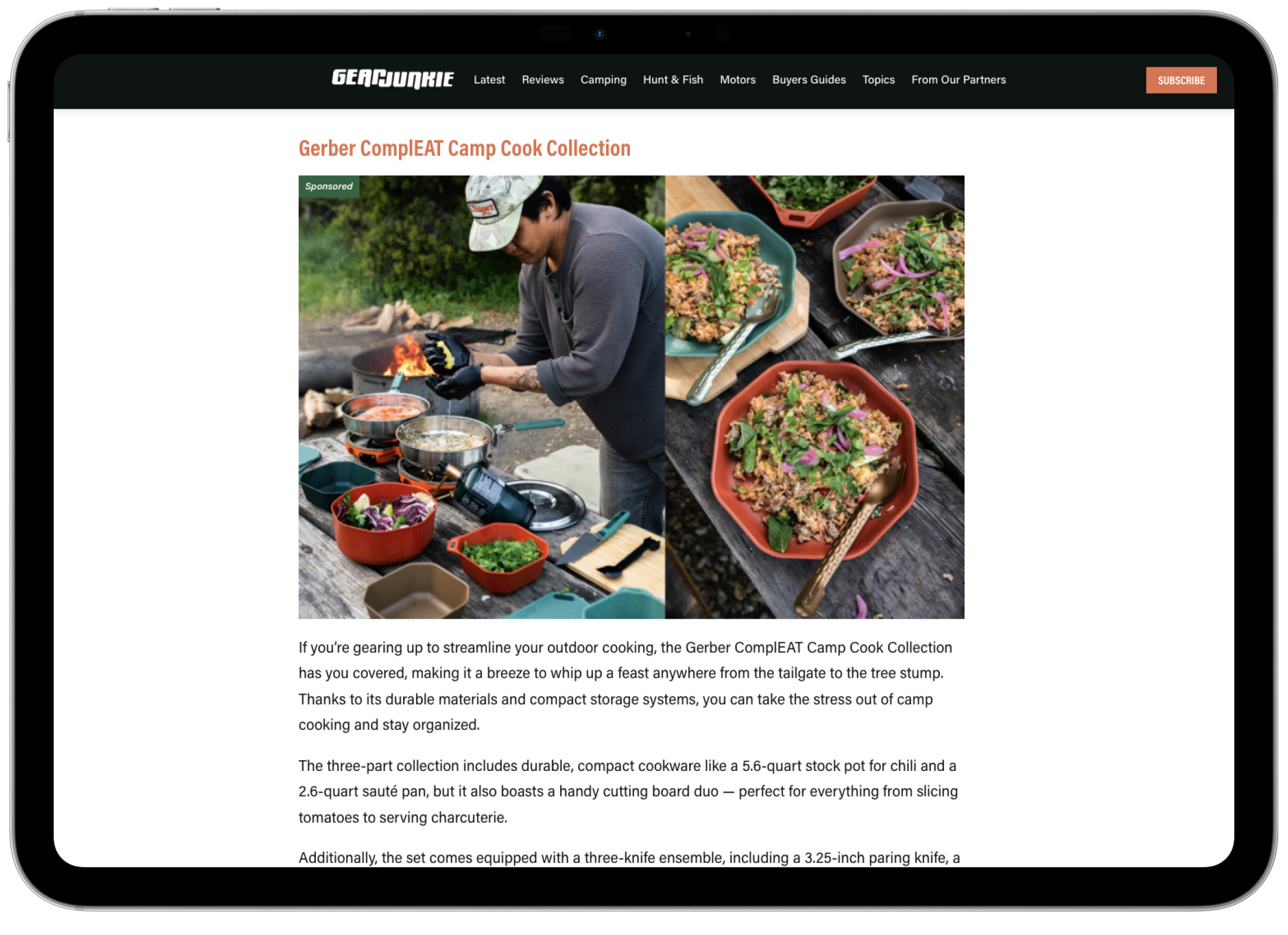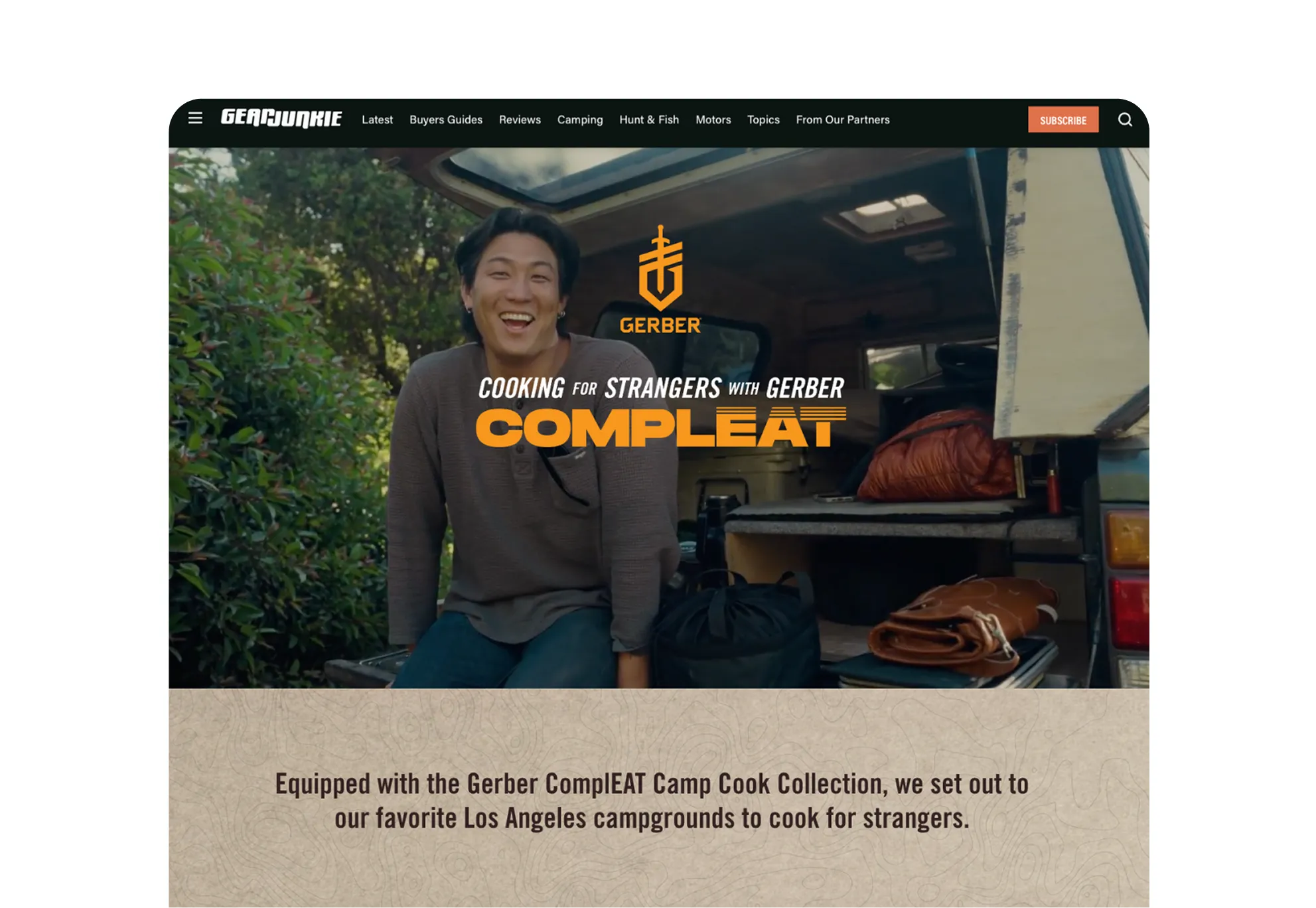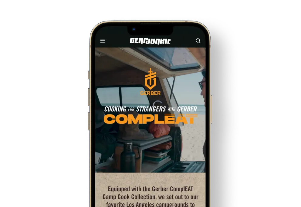 GearJunkie executed a 360-degree campaign featuring Run-of-Site display media, a Camping Category Takeover, and newsletter takeovers. The campaign’s centerpiece was the "Cooking for Strangers" custom content series, which showcased the ComplEAT collection in action, supported by product placements in seasonal gift guides and an interactive content microsite.
