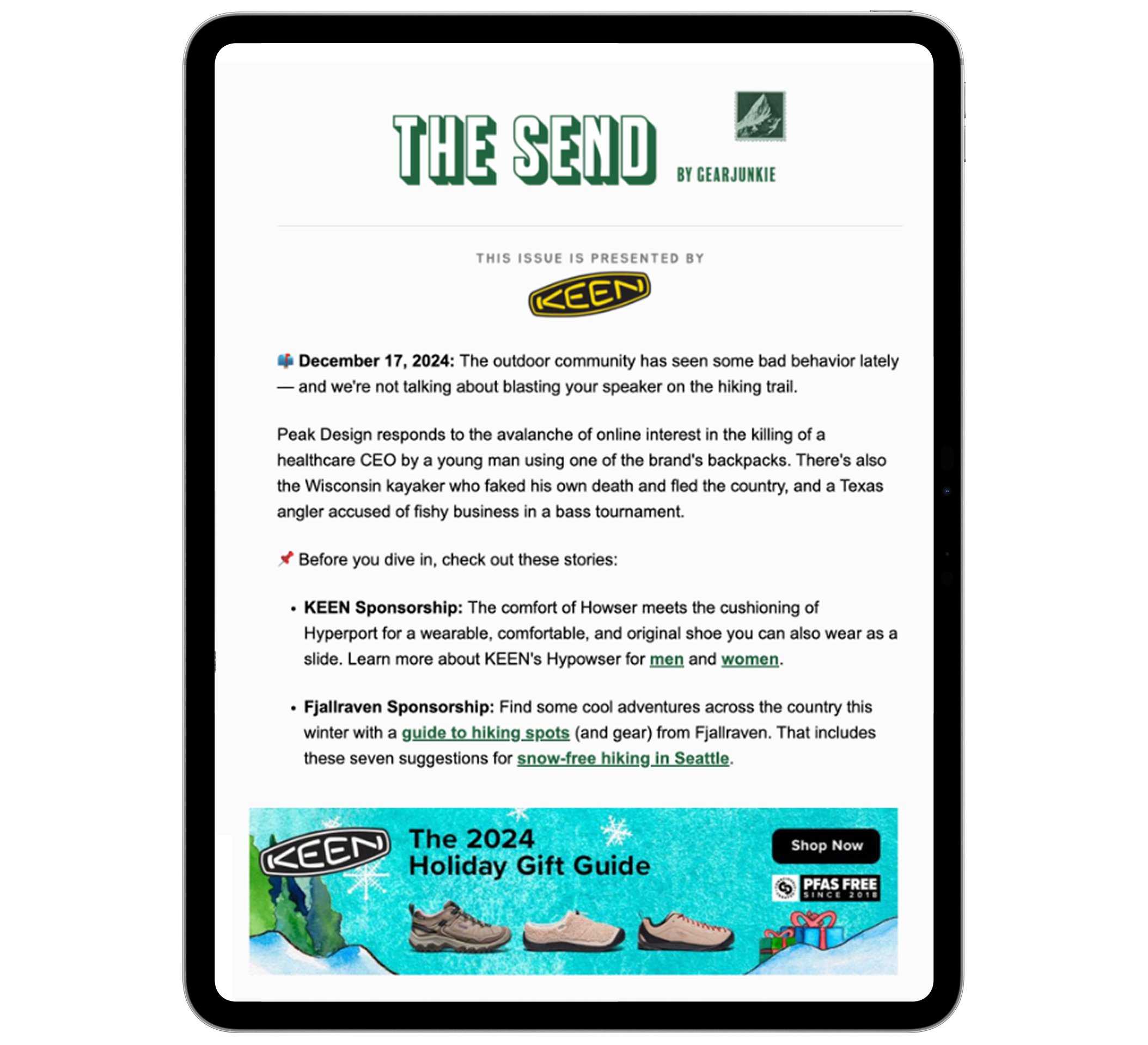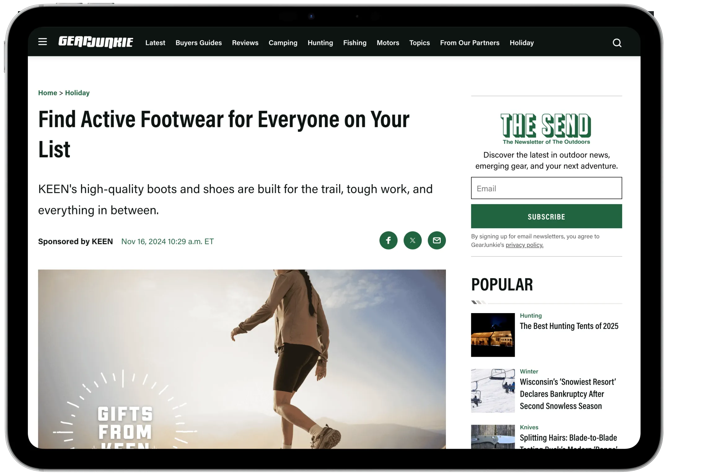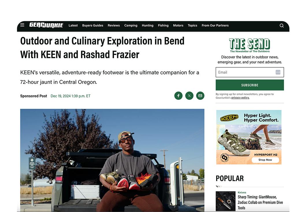 Through authentic creator storytelling, product-focused editorial, and high-impact seasonal activations, KEEN connected meaningfully with its target audience. The campaign exceeded video view goals by over 1.6 million and generated strong engagement across the microsite, giveaways, and newsletters.