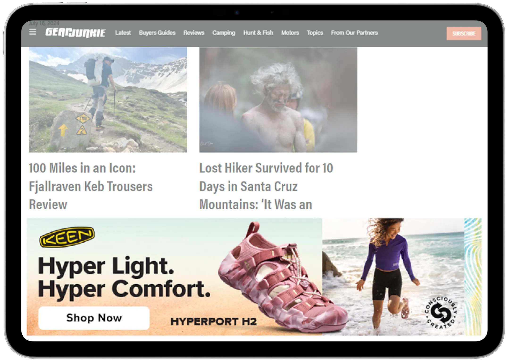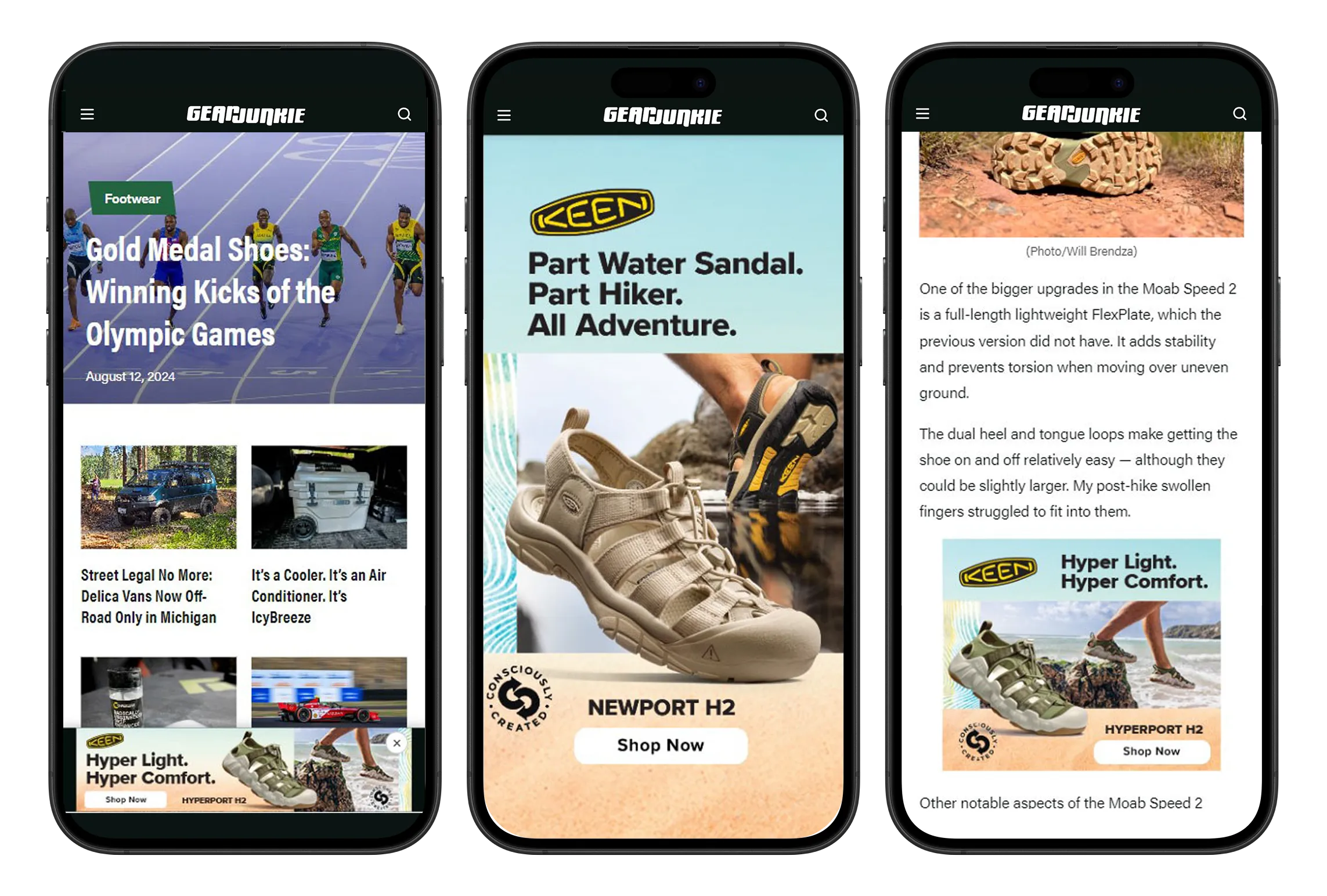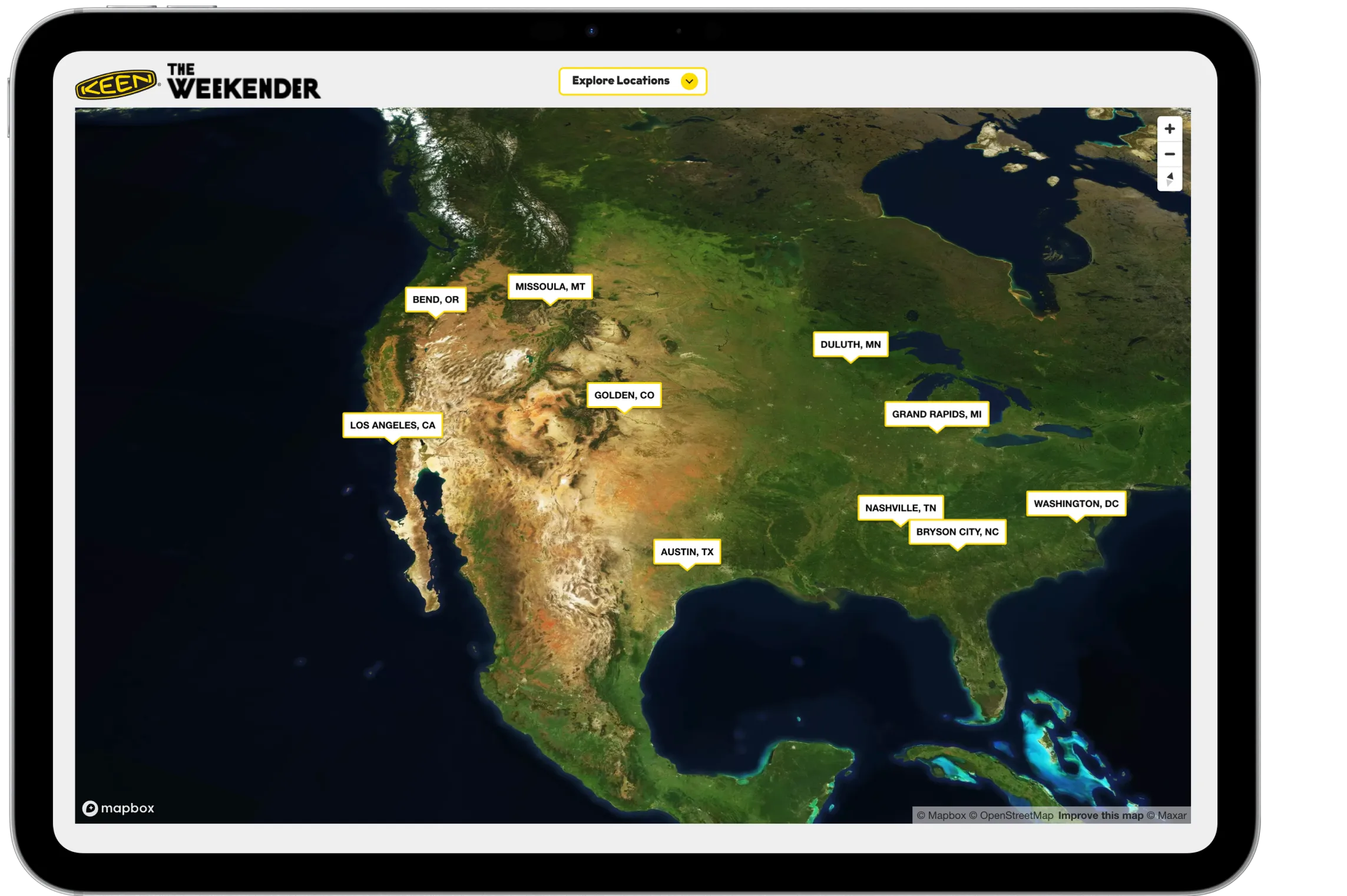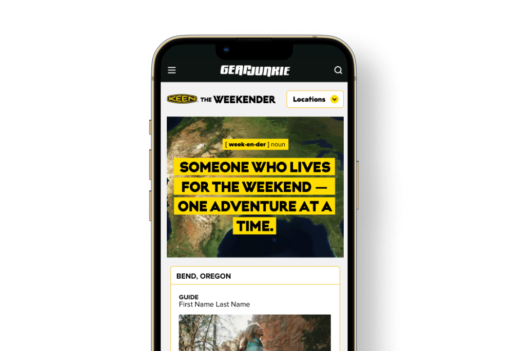 AllGear Digital executed a year-round, multi-platform campaign anchored by The Weekender—a creator-led series pairing short-form videos with local itineraries—amplified by custom editorial, holiday promotions, and display media. A Weekender interactive microsite served as a dynamic hub for curated itineraries and shoppable product storytelling, connecting upper-funnel inspiration to lower-funnel consideration. The campaign highlighted KEEN hero styles across Trail Run, Hike, and Water, integrating products into real-world itineraries and creator narratives to drive discovery.