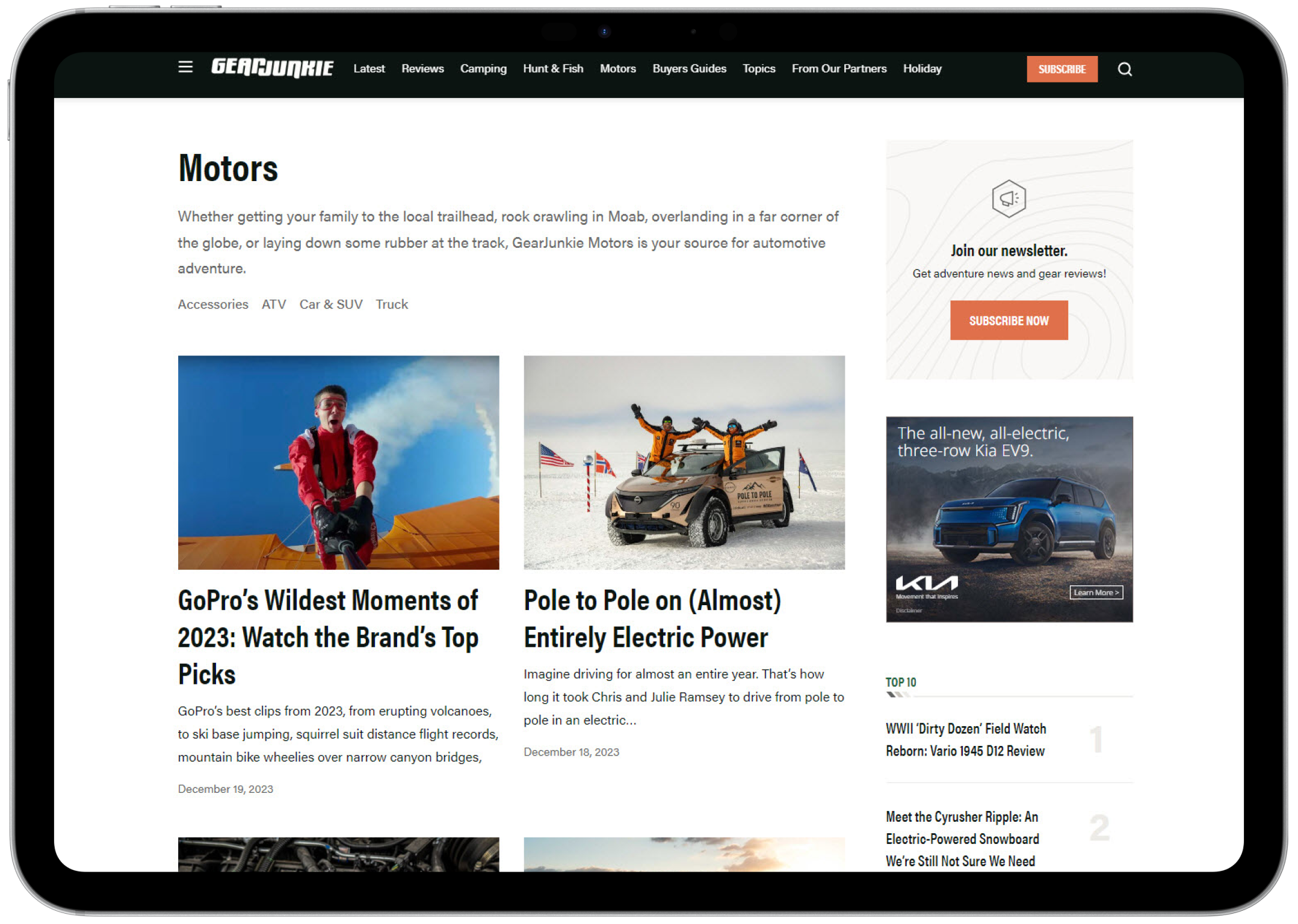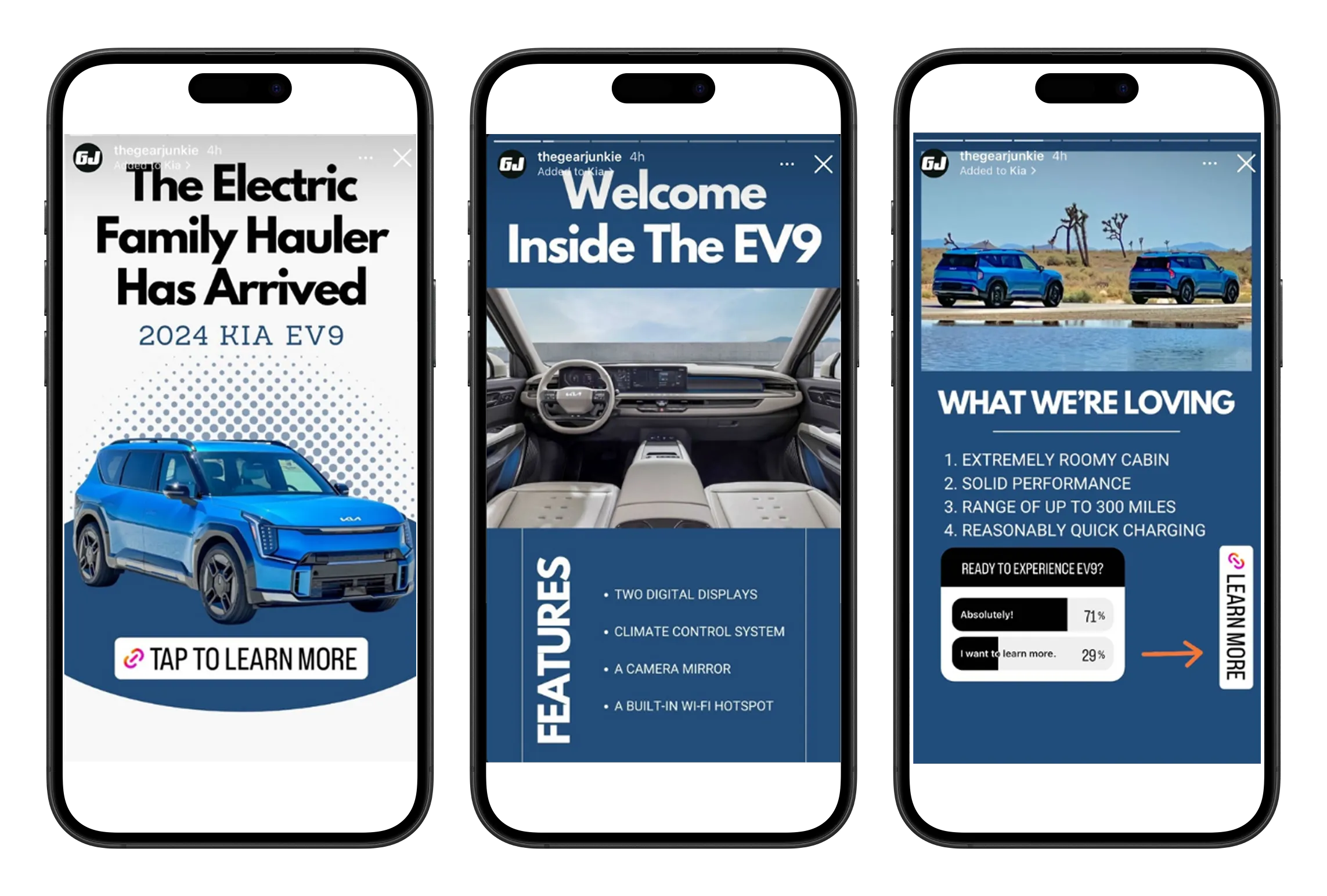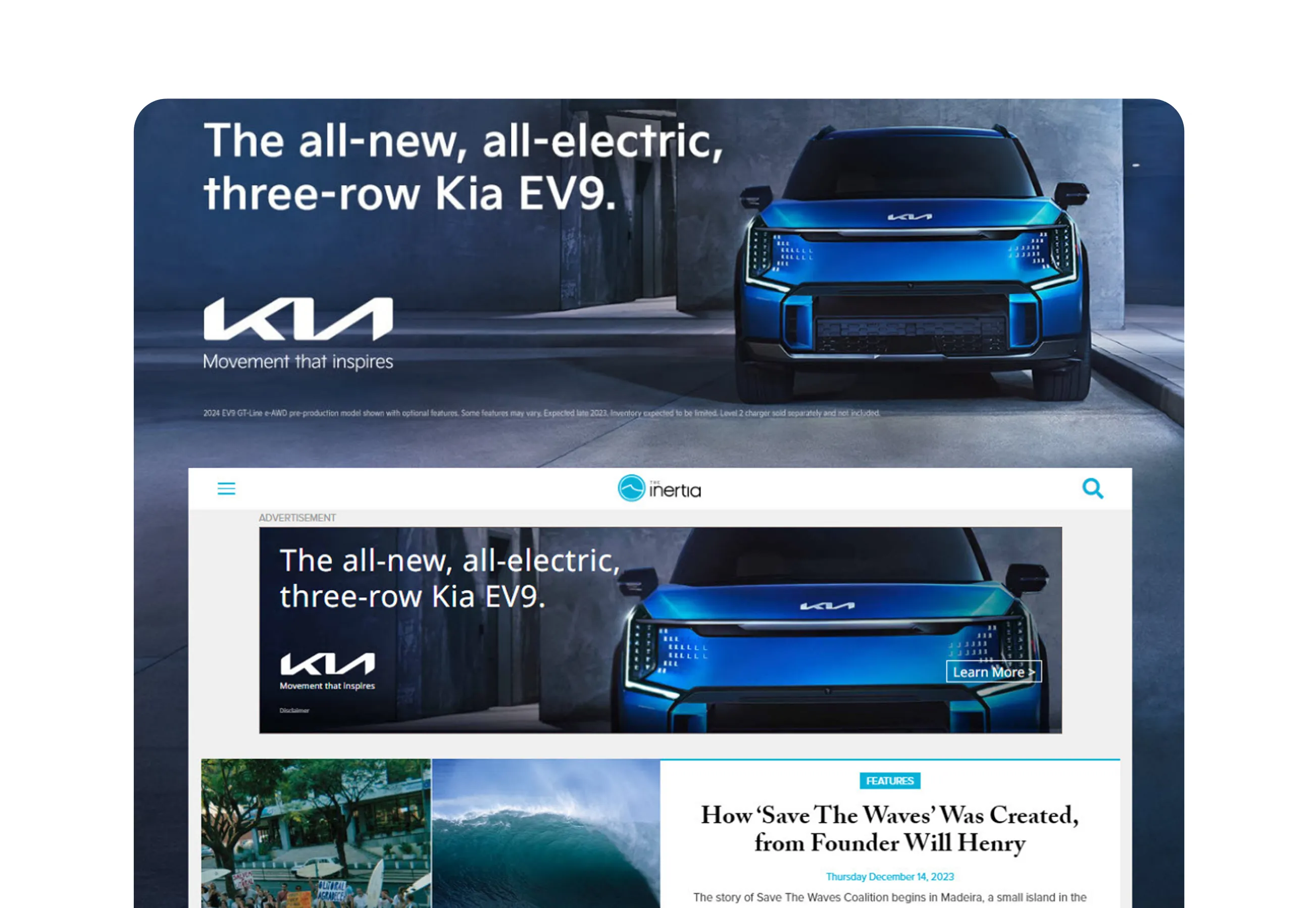 AllGear Digital delivered a robust pre-launch campaign featuring standard and high-impact display, rich media video, pre-roll video, and a Motors Category Takeover. We further amplified existing Kia EV9 editorial coverage across social and newsletter channels. A Brand Lift Study evaluated the impact of the campaign.